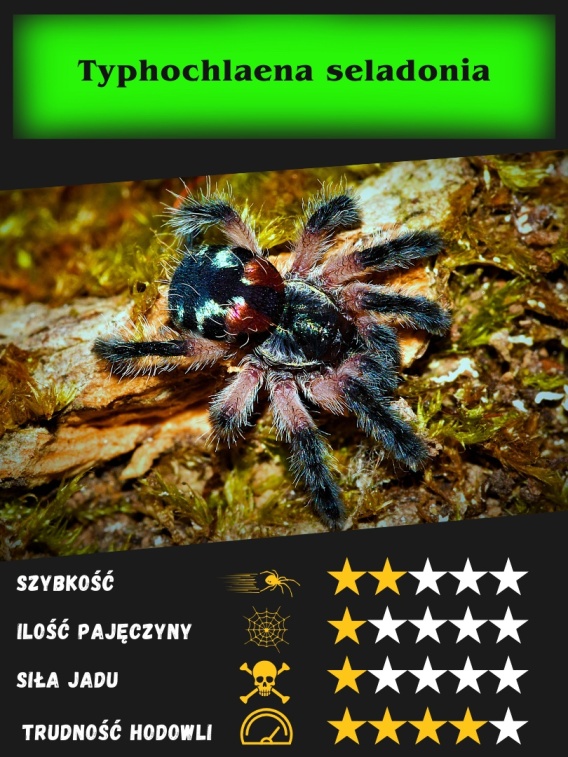Ten gatunek, mimo niewielkich rozmiarów, prezentuje unikalne zachowania. Typhochlaena seladonia buduje miniaturowe gniazda z kory, liści i porostów które łączy pajęczyną, tworząc w nich swoją kryjówkę. To niezwykła cecha, niespotykana u większości ptaszników – pająk potrafi aktywnie konstruować „domki” z dostępnych materiałów, co czyni go niezwykle ciekawym w obserwacji.